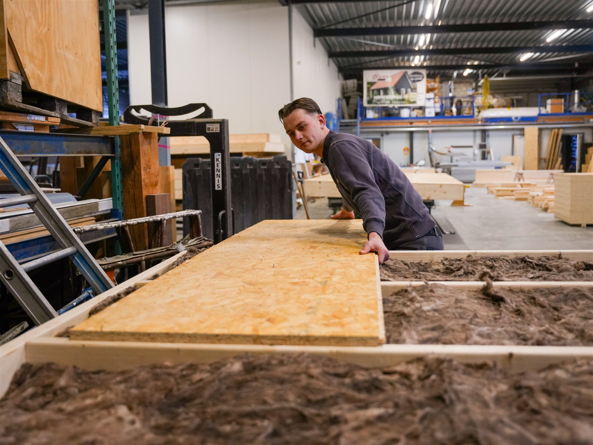 We maken veel onderdelen alvast in onze werkplaats, in losse elementen. Denk aan wanden, vloeren, dakdelen en (waar nodig) kozijnen. Daardoor gaat de montage op locatie sneller en blijft de kwaliteit constant, omdat we veel in een gecontroleerde omgeving kunnen maken.